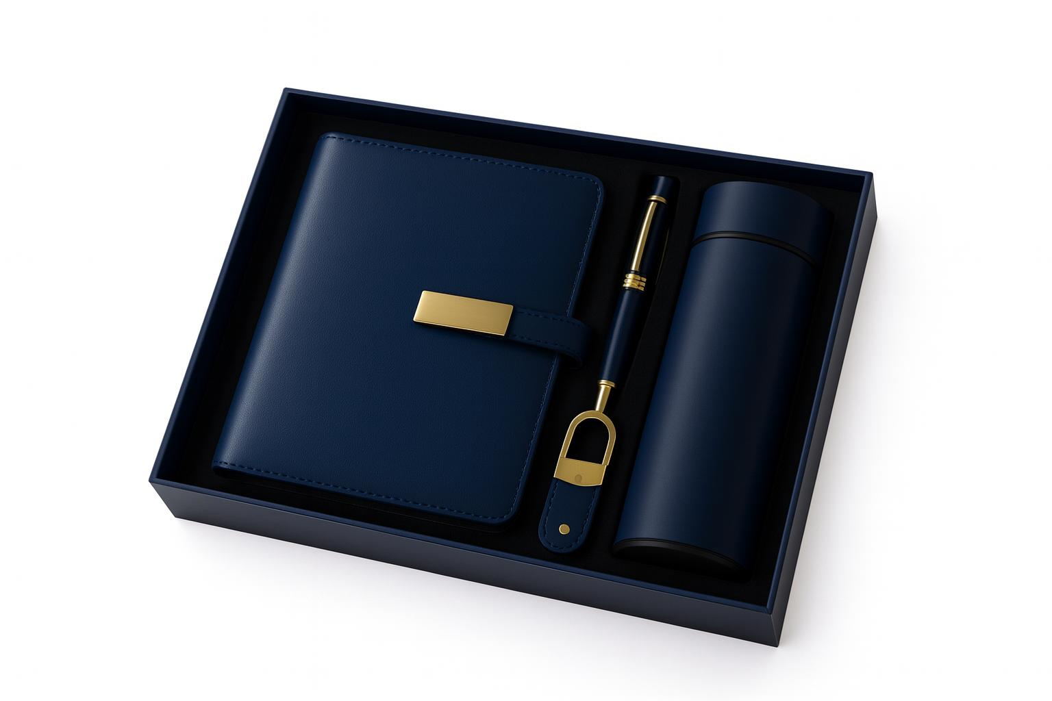 Coffret Agenda VIP 16x22 cm en similicuir Avec une Bouteille Thermos et 2 Accessoires Complets coloris au choix Cet ensemble exclusif combine élégance et fonctionnalité pour les professionnels en déplacement. Il comprend une clé USB de 32 Go pour stocker des fichiers importants, une bouteille thermos intelligente avec affichage de température pour maintenir vos boissons à la température idéale, et un stylo raffiné pour des notes soignées. L’agenda de taille 16x22 cm, avec couverture en similicuir et reliure à 6 anneaux, contient 144 pages en papier ivoire, offrant des options de grille semainier pour une organisation optimale. Cet ensemble est parfait pour un usage professionnel tout en ajoutant une touche de style et de praticité au quotidien.