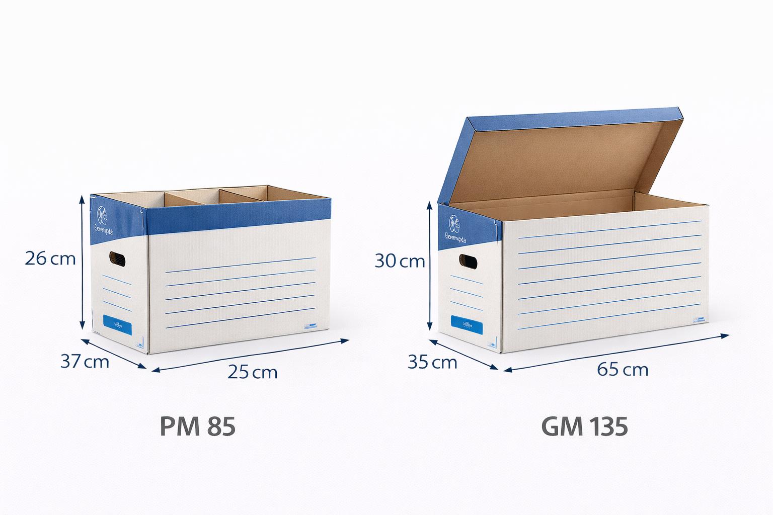 boîtes d'archives en carton disponibles en trois tailles différentes : PM 85 : Dimensions de(8,5\25\34\ cm} MM 100 : Dimensions de (10/25/34\ cm}\). GM 135 : Dimensions de(13,5\25\34\cm. Ces boîtes sont conçues pour le rangement de documents et sont fabriquées en carton recyclable.